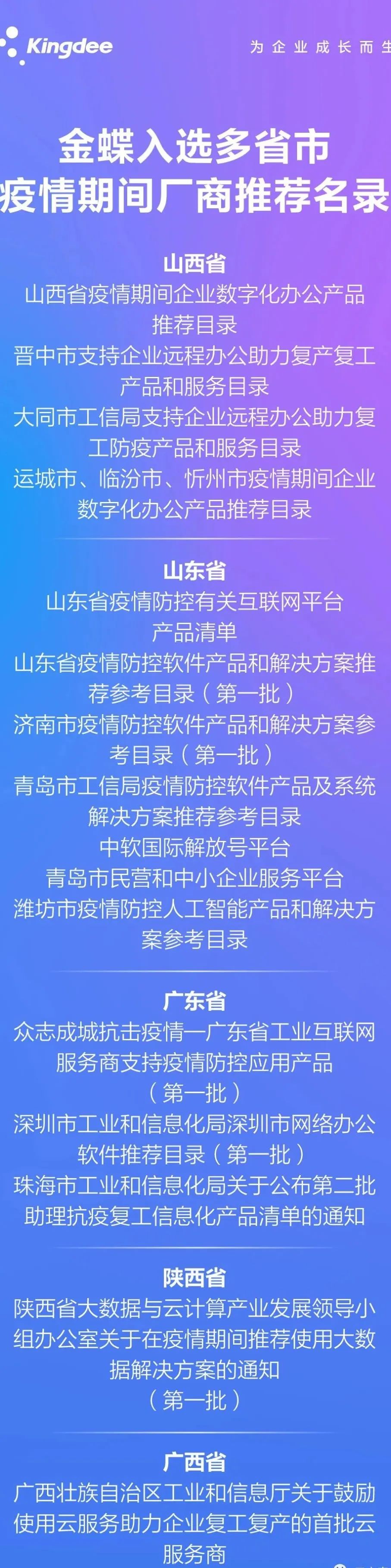 隨著企業陸續復工,全國進入新型冠狀病毒疫情防控的關鍵時期,為支持各單位實時、智能化管理員工在疫情期間的健康狀態,實現遠程在線辦公,各省市政府相繼發布關于疫情期間推廣使用企業軟件推薦名錄。截止至2月14日12:00,金蝶入選 30 個省市政府推薦名錄。云之家作為新一代智能移動協同平臺,經歷重重甄選,亦成功被多地政府機構推薦,助力企業有序復工,高效協同。