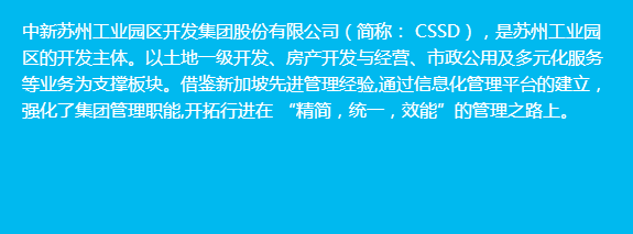 1994年經對外經濟貿易合作部批準,國家工商行政管理局批準,成立合資公司“中新蘇州工業園區開發有限公司”。 中新蘇州工業園區開發有限公司簡稱CSSD,是蘇州工業園區的開發主體。2009年6月24日,公司更名為中新蘇州工業園區開發集團股份有限公司(簡稱:中新集團)。 構建起強大、系統的城市綜合發展主業體系,以土地一級開發、房產開發與經營、市政公用及多元化服務等業務支撐板塊,涵蓋城市規劃、土地開發、房產開發、市政公用、招商服務、工程咨詢管理、教育服務、酒店經營、物業管理等多方面。